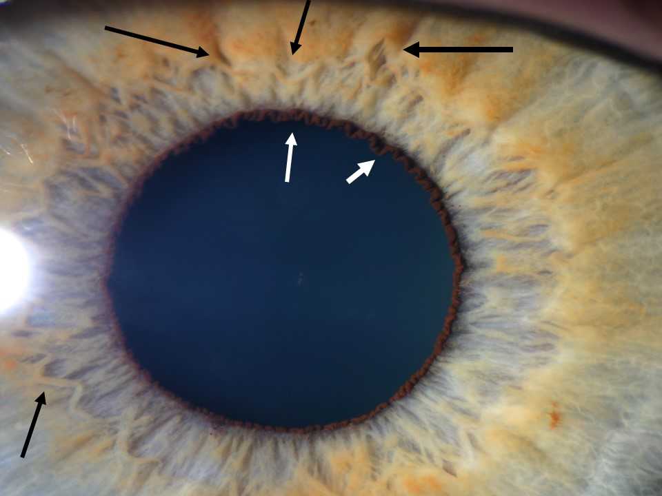 Irydologia identyfikuje wówczas zmiany w stanie aktywności włókien, koncentrację barwnika, rozluźnienie utkania, szczeliny, głębokie krypty i wiele innych znaków, które wskazują jednoznacznie na obniżoną lub podwyższoną aktywność w danym rejonie. W takiej sytuacji analiza zjawisk na powierzchni tęczówki w połączeniu z innymi badaniami pozwala stwierdzić rodzaj zaburzeń jakie towarzyszą danej jednostce oraz ustalić właściwy tor terapii.